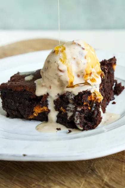 - Cut a square of brownie, place a scoop of maple pecan ice cream on top, drizzle over a little extra maple syrup and a small sprinkle of salt. Serve immediately for a gooey treat.