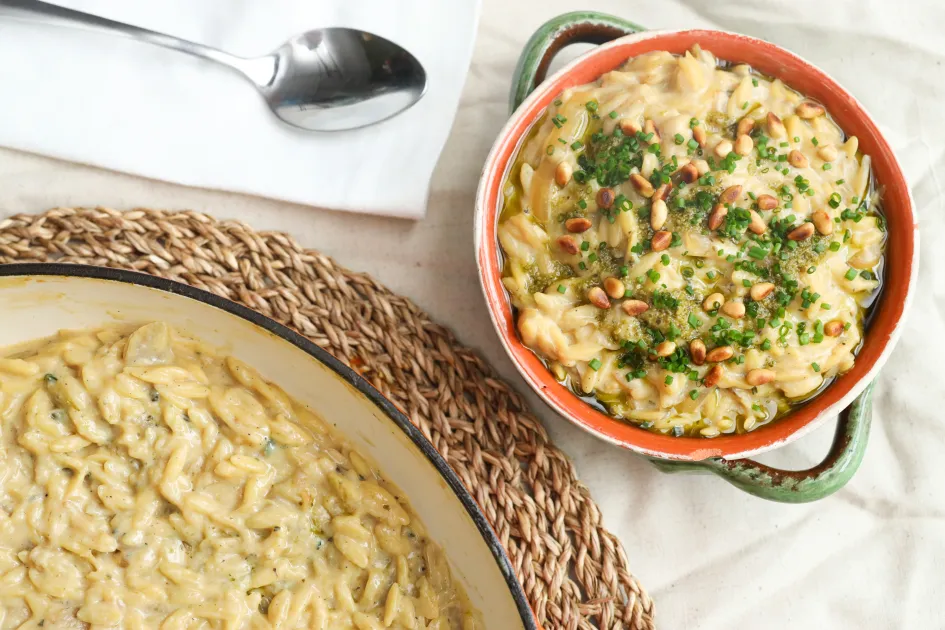 Sweet, caramelised onions, creamy tofu, and a drizzle of herby pesto oil come together in this dreamy orzo dish. It’s cosy, delicious, and brings 23g of protein to every bowl.