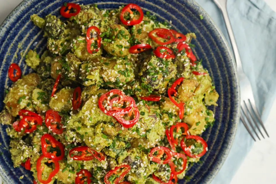 - Add the crushed roast veggies to your serving dish - drizzle over the dressing, sprinkle with chives, red chilli and sesame seeds and enjoy!
