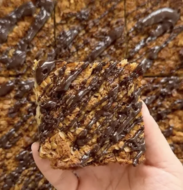 - Once the chocolate has melted drizzle it over the flapjacks and serve.