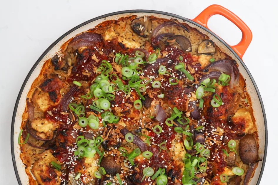 Smoky tofu, tender mushrooms, sticky chilli jam goodness - all baked in one pot. This chilli jam baked rice is a no-fuss, no-mess dish that requires minimal effort.